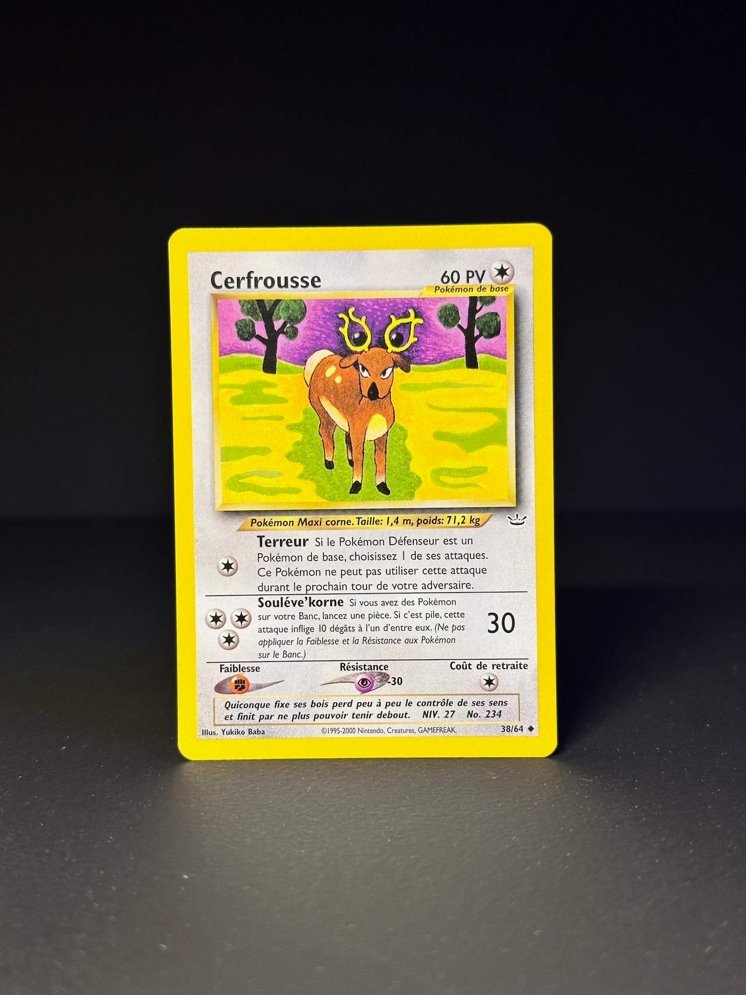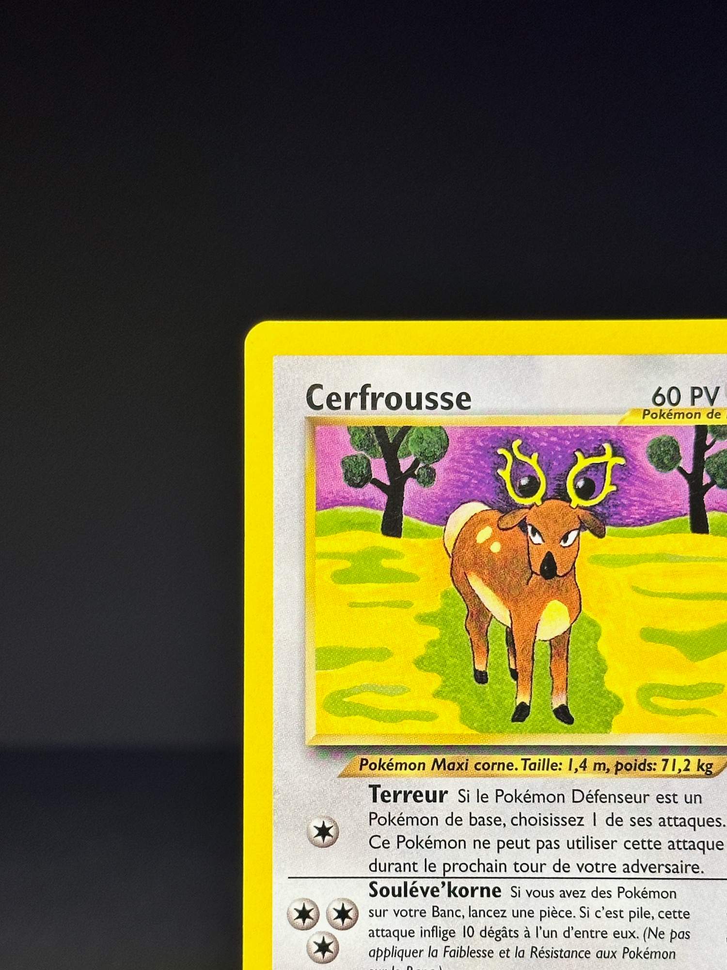 Souléve’korne – Si vous avez des Pokémon sur votre Banc, lancez une pièce. Si c’est pile, cette attaque inflige 10 dégats à l’un d’entre eux. (Ne bas appliquer la Faiblesse et la Résistance aux Pokémon sur le Banc).